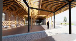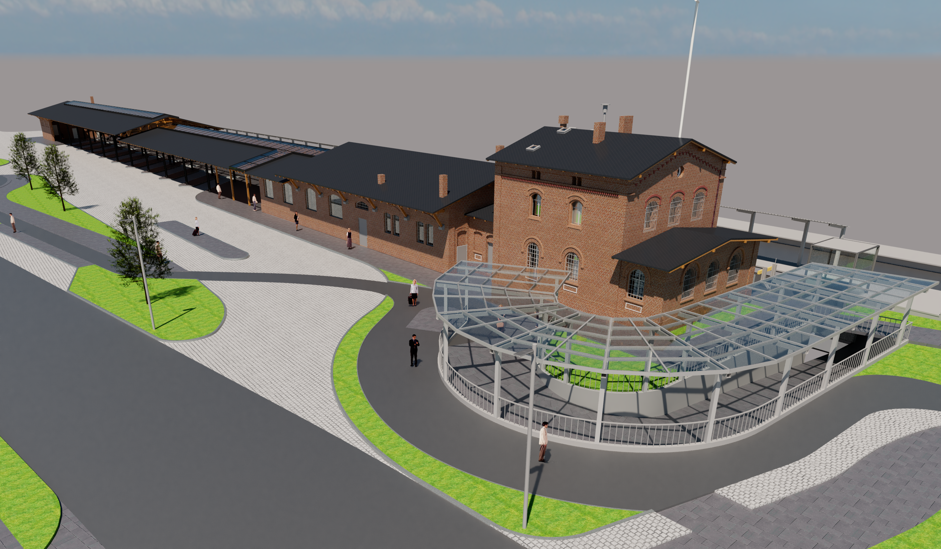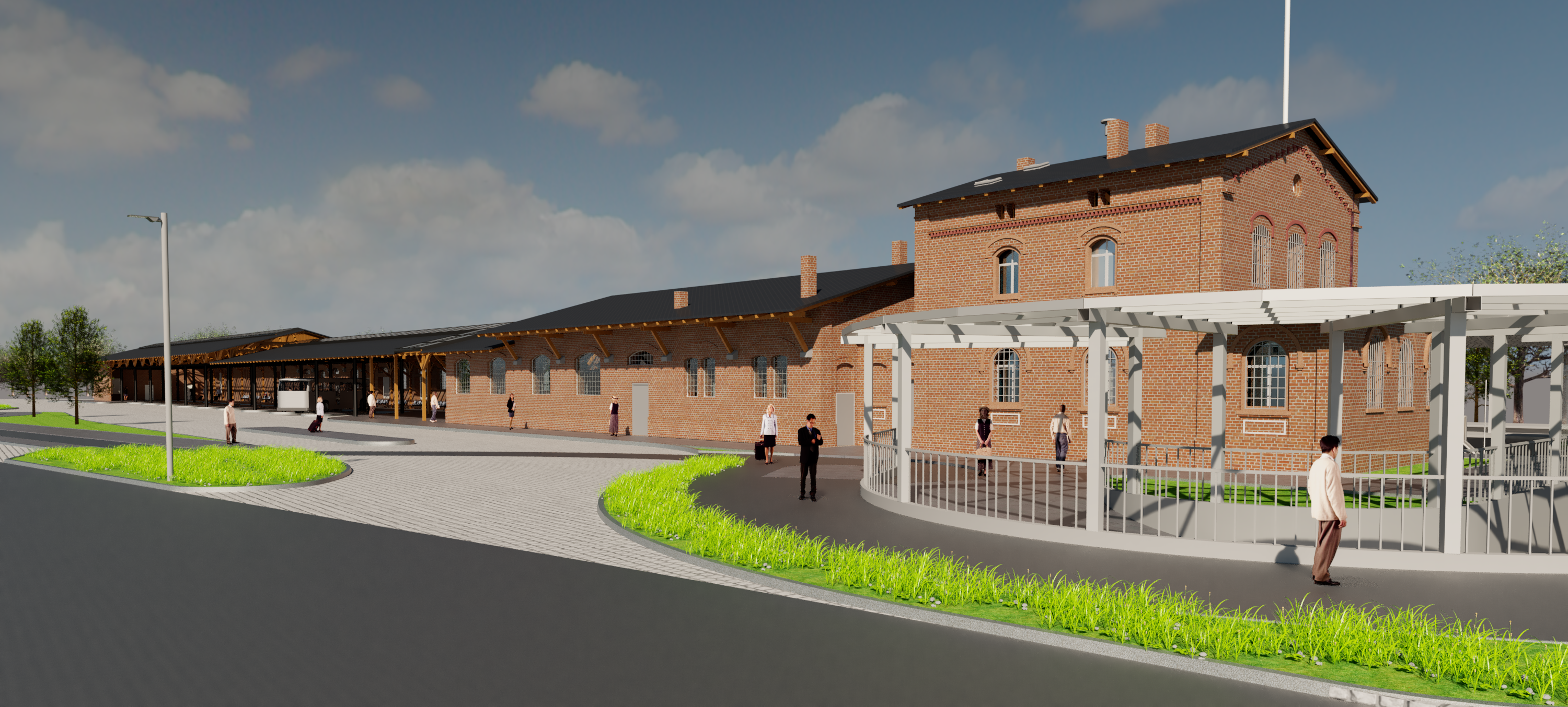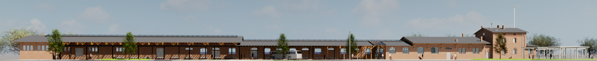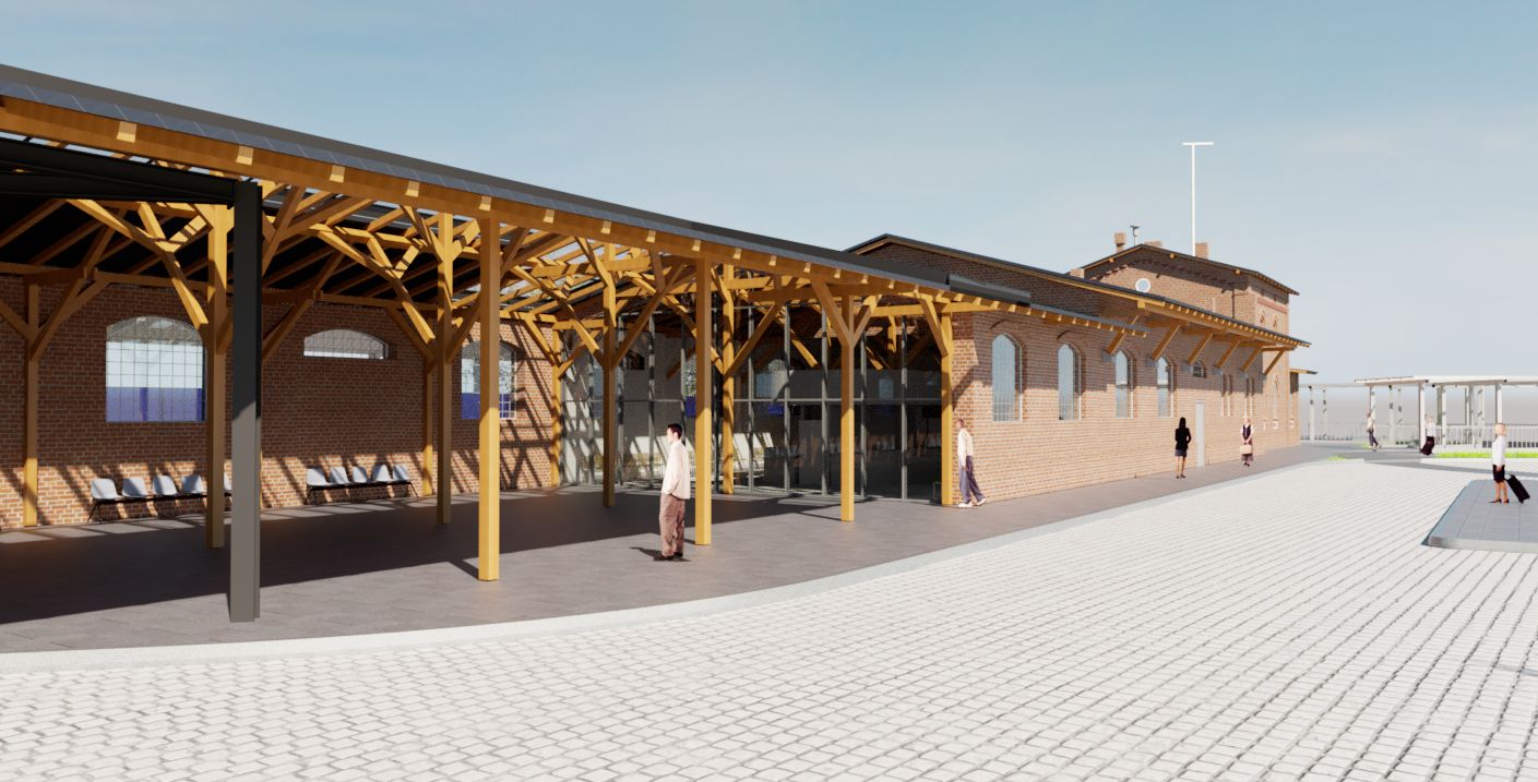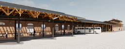 Oba budynki połączone są podpiwniczonym, dwukondygnacyjnym łącznikiem Zaplanowano zachowanie formy i gabarytów oryginalnych obiektów. Budynek A – zadaszone perony i strefa dworca PKS. Koncepcja zakłada wydzielenie części budynku na pomieszczenia obsługi podróżnych i biuro najmu autokarów. W obiekcie zlokalizowane będą toalety dla podróżnych, toalety dla kierowców, część socjalna dla pracowników oraz pomieszczenia techniczne i gospodarcze. Wejście dla pasażerów prowadzi do otwartej do wysokości dachu poczekalni, w której pozostawia się istniejącą konstrukcję drewnianą w formie niezabudowanej jako element architektury wnętrz. W poczekalni zaprojektowano miejsce na małą gastronomię, informację turystyczną, kasy i toalety dla podróżnych. Pozostała cześć budynku A, po rozbiórce jednej ze ścian zewnętrznych, pełnić będzie funkcję zadaszonych stanowisk peronowych na 10 autobusów.