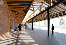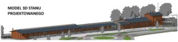 Budynek B – strefa obsługi kierowców. Budynek będzie pełnił funkcję administracyjną i strefę bieżącej obsługi kierowców. Zaprojektowano tam pomieszczenia obsługi kierowców wraz z pomieszczeniem socjalnym, toaletami i magazynem oraz pomieszczenia obsługi administracyjnej centrum przesiadkowego wraz z pomieszczeniem socjalnym, porządkowym i serwerownią.