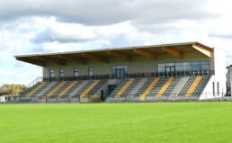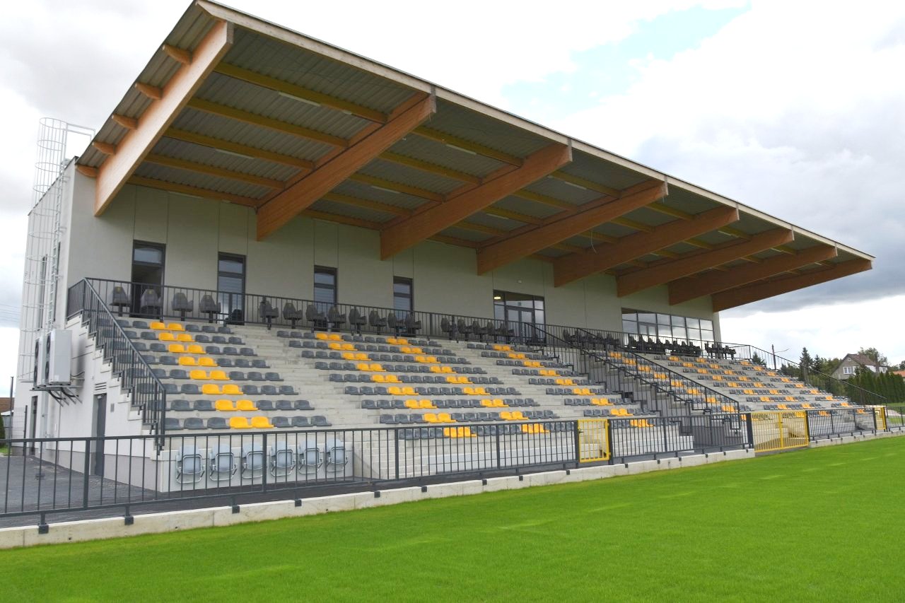 Zaprojektowano budynek klubowy dwukondygnacyjny, w kształcie prostopadłościanu, od strony zachodniej połączony z budynkiem trybuny zewnętrznej. Konstrukcja nośna dachu budynku klubowego, z częścią wspornikową stanowiącą konstrukcję pod zadaszenie trybun, wykonana z dźwigarów z drewna klejonego. Na parterze budynku klubowego zaprojektowano zaplecze szatniowo-sanitarne dla zawodników gospodarzy i gości, obszar siłowni oraz obszar fitness wraz z zapleczem szatniowo – sanitarnym damskim oraz męskim, obszar dostępnych od zewnątrz toalet dla publiczności oraz pomieszczenia techniczne/magazynowe, ulokowane w podtrybuniu. Na piętrze budynku zaprojektowano pomieszczenia biurowe, szatnie dla trenerów i sędziów z własnym węzłem sanitarnym, pomieszczenie porządkowe, toalety ogólnodostępne oraz strefę VIP. Od strony wschodniej zaprojektowano zadaszone trybuny z miejscami siedzącymi (siedziska) przeznaczonymi dla widzów (532 + 6 dla ON) oraz z najwyższym poziomem z miejscami siedzącymi (fotele z oparciami) dla gości VIP i komentatorów (54), z którego prowadzi bezpośrednie wejście do budynku klubowego na piętrze.