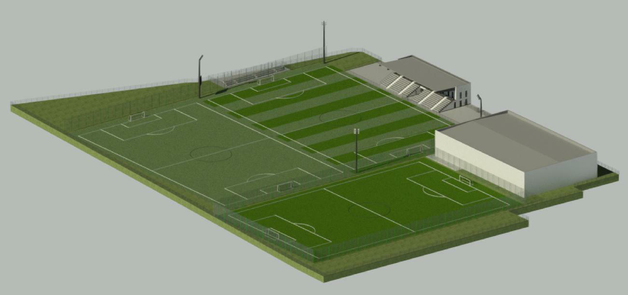 Projekt budowy centrum sportowego dla dzieci i młodzieży, obejmujący budynek klubowy z częścią fitness oraz z zadaszaną trybuną zewnętrzną, budowę boisk do piłki nożnej (głównego z nawierzchnią naturalną oraz treningowego z nawierzchnią sztuczną), montaż masztów oświetleniowych dla boisk piłkarskich oraz wykonanie przynależnego zagospodarowania terenu.