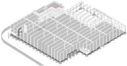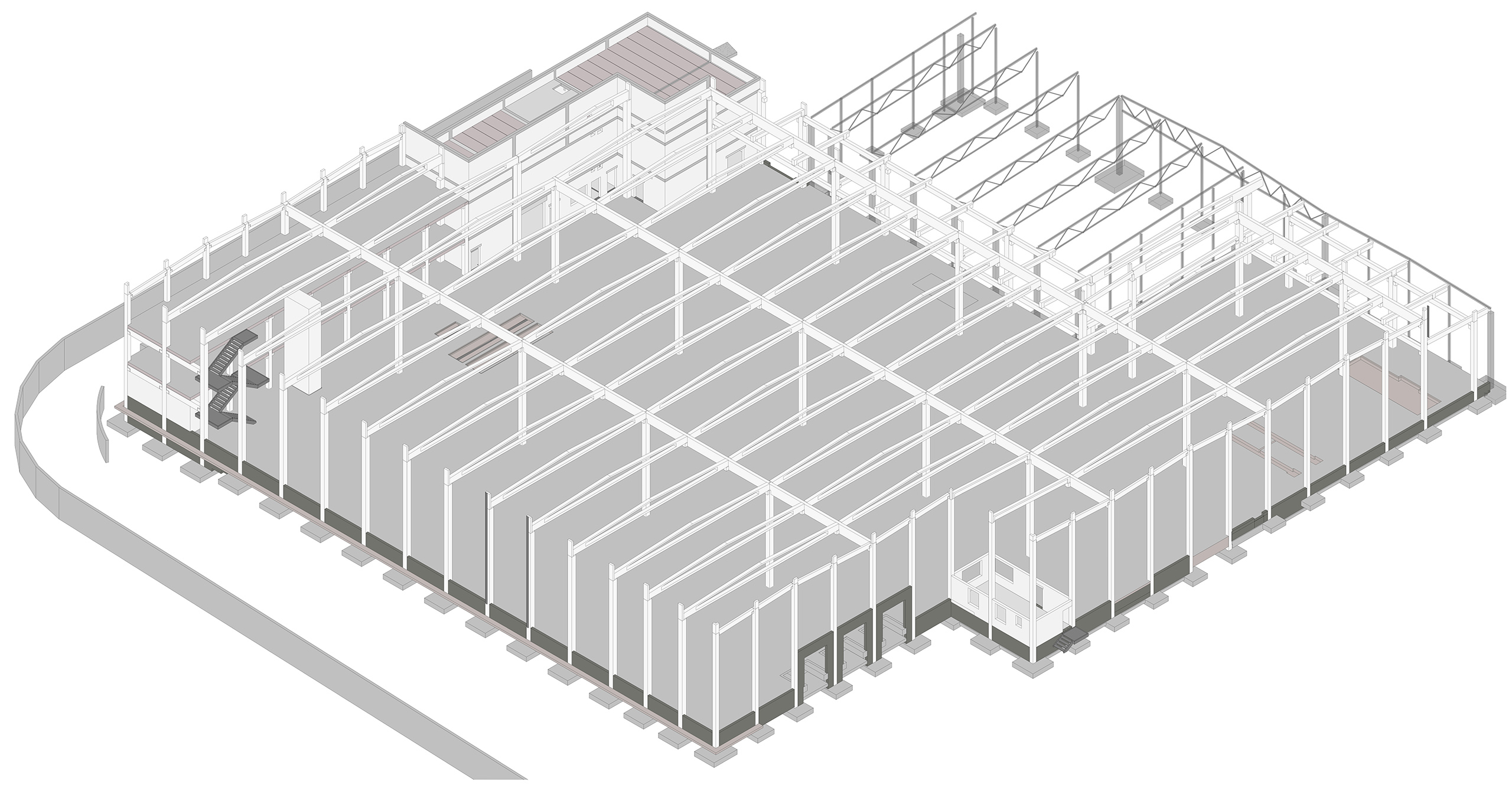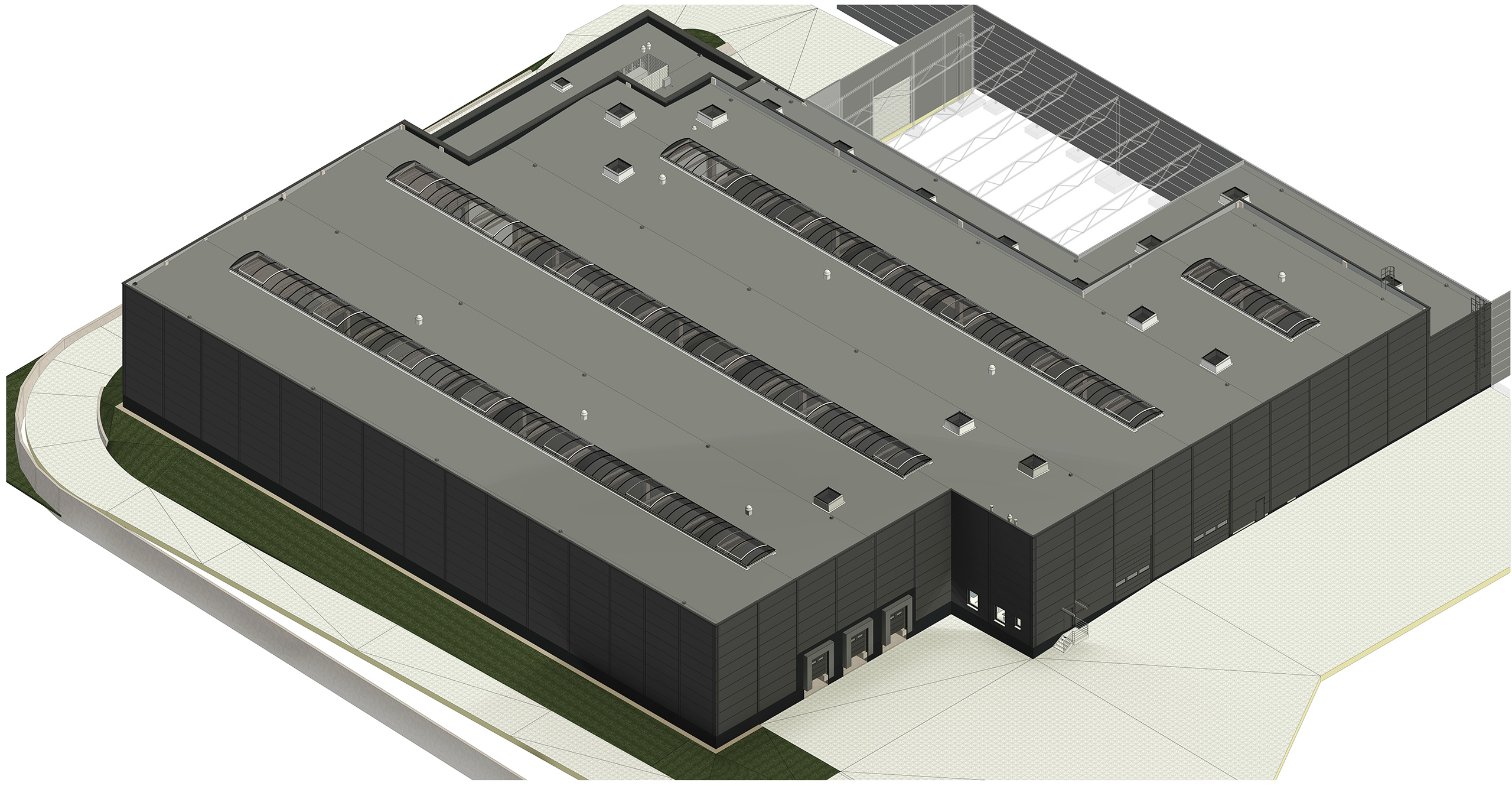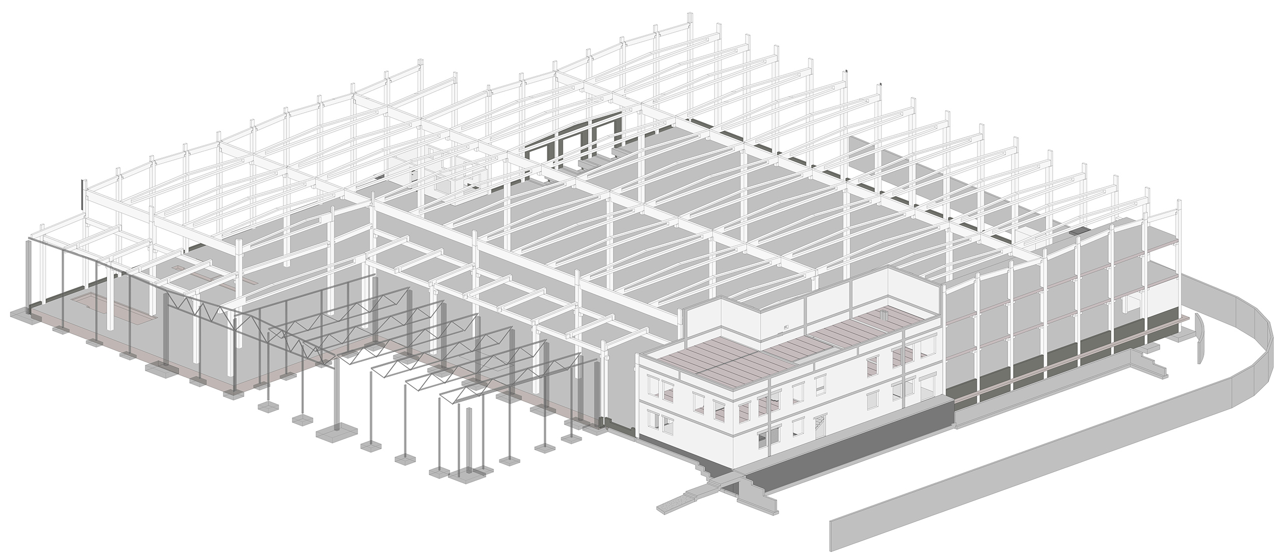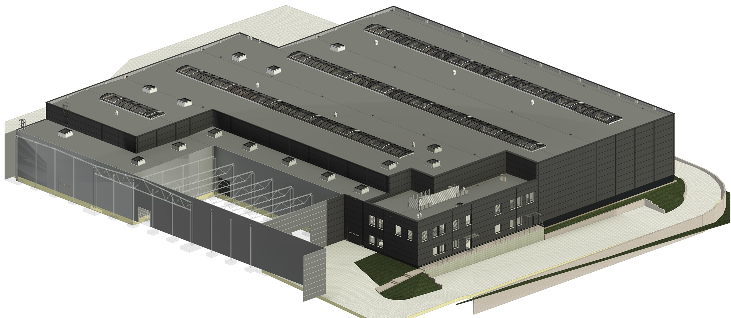 Projekt rozbudowy istniejącego zakładu produkcji opakowań kartonowych. Do istniejącej hali pomocniczej oraz magazynowej zaprojektowano, od strony zachodniej, dobudowę hali magazynowej wraz z częścią socjalno-biurową.